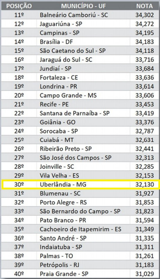Com pontuação final de 32,130 pontos, Uberlândia avançou duas posições em relação ao ranking do ano passado. No comparativo, Uberlândia é a segunda mais inteligente e conectada de Minas Gerais, atrás apenas de Belo Horizonte. Por apresentar mais negócios inovadores, está à frente, por exemplo, de capitais como Porto Alegre (RS), Palmas (TO) e Aracaju (SE), que ficaram, respectivamente, nas 32ª, 38ª e 53ª posições. Entre todos os municípios analisados, 41 têm população superior a 500 mil habitantes, como é o caso de Uberlândia.