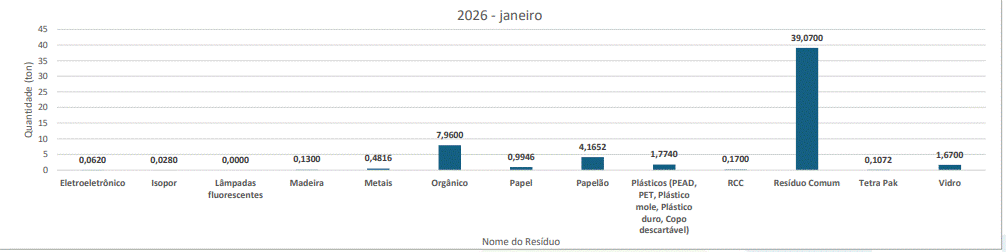 Legenda: o gráfico apresenta os principais materiais monitorados no mês; o total de recicláveis destinados corretamente em janeiro somou 17,5430 toneladas.